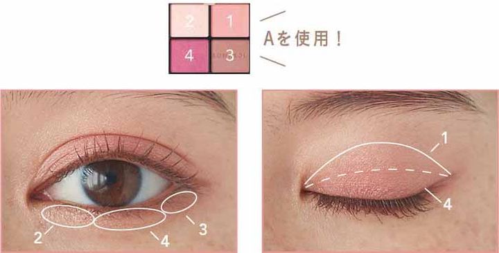 1 の淡いピンクをアイホール全体になじませ、二重幅に4 の濃いピンクを重ねる。