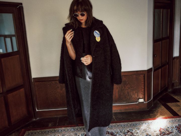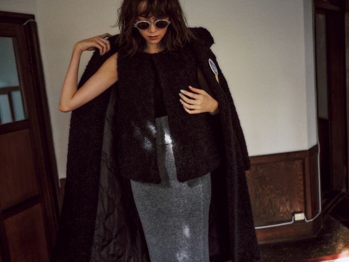 「もしこれがファーだったらゴージャス過ぎて二の足を踏みそうだけど、モコモコした素材なら気軽に着られる。そんな旬度高めのコートとベストの相手役には、継ぎ目のないホールガーメント編みのスカートを。起毛ニット同士のウォーミングな組み合わせもオススメ♡」(樋口さん)