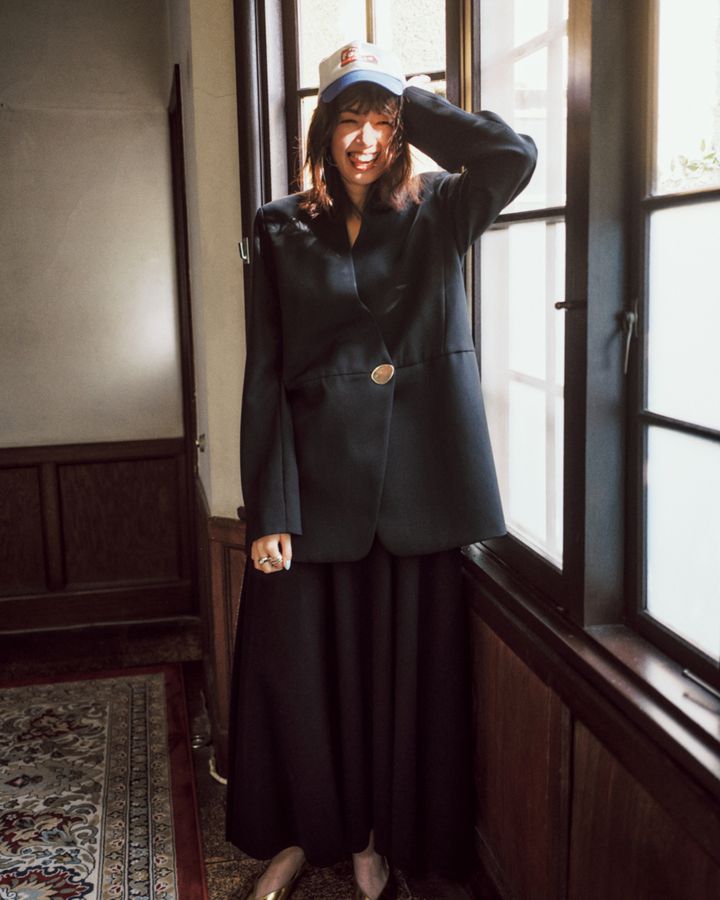 「全身をAラインに仕上げることで、黒オンリーでも申し分ナシの華やかさ。ジルサンダー出身のデザイナーが手がけるジャケットは、有機的な金ボタンとVあきからのぞく素肌が何ともモードです。上下共にウール100%の上質感を、ユーズドのキャップで巧みにハズすと◎」(樋口さん)
