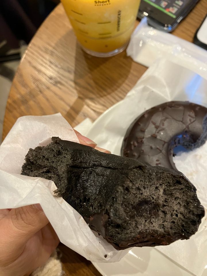 ブラックココアのビターなドーナツ生地に甘さ控えめのチョコレートクリームを入れ、チョココーティングし、さらにチョコスプレーがトッピングされています!
