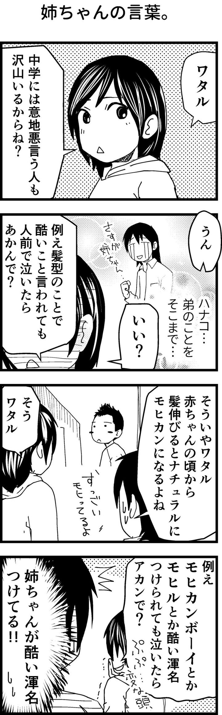 中学校には、意地悪を言う人がたくさんいると忠告するハナコちゃん。髪型について悪口を言われても、泣いてはいけないと戒めます。赤ちゃんのころから、髪が自然とモヒカンになってしまうというワタルくん。自分が忠告したのにもかかわらず、「モヒカンボーイ」「モヒル」といったアダ名をつけてしまう、ハナコちゃんなのでした。