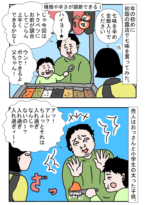 初詣に行った際、七味の辛さを調節できる露店があったそう。ワンタケさんが七味のブレンドを注文すると、露店にいた小学生の子どもが調合してくれることに。調合中、露店のおじさんが合いの手を入れながら、場を盛り上げます。その後、七味を使うたびにその光景が脳裏をよぎる、ワンタケさんなのでした…。
