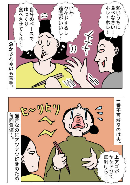 「冷めても美味いもんが美味い」ような気がするワンタケさん。一緒に食事をしている相手から「熱いうちに食べなさい!」と急かされるのも苦手なのだそう。一方、夫は猫舌なのにアツアツ好きで、いつも口の中を火傷しているので「一番不可解」と首をかしげるワンタケさんなのでした…。