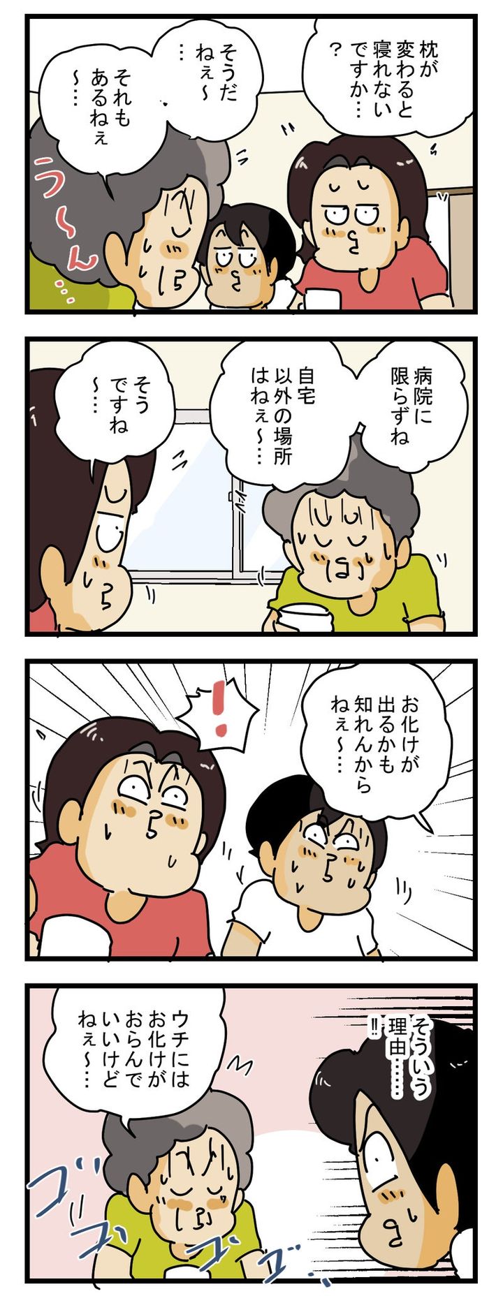 枕が変わると寝られないのかと思いきや、お化けが理由なんてお母さんはかわいらしいですよね。確かに夜の病院は、何かが出そうな気がしないでもありません…。