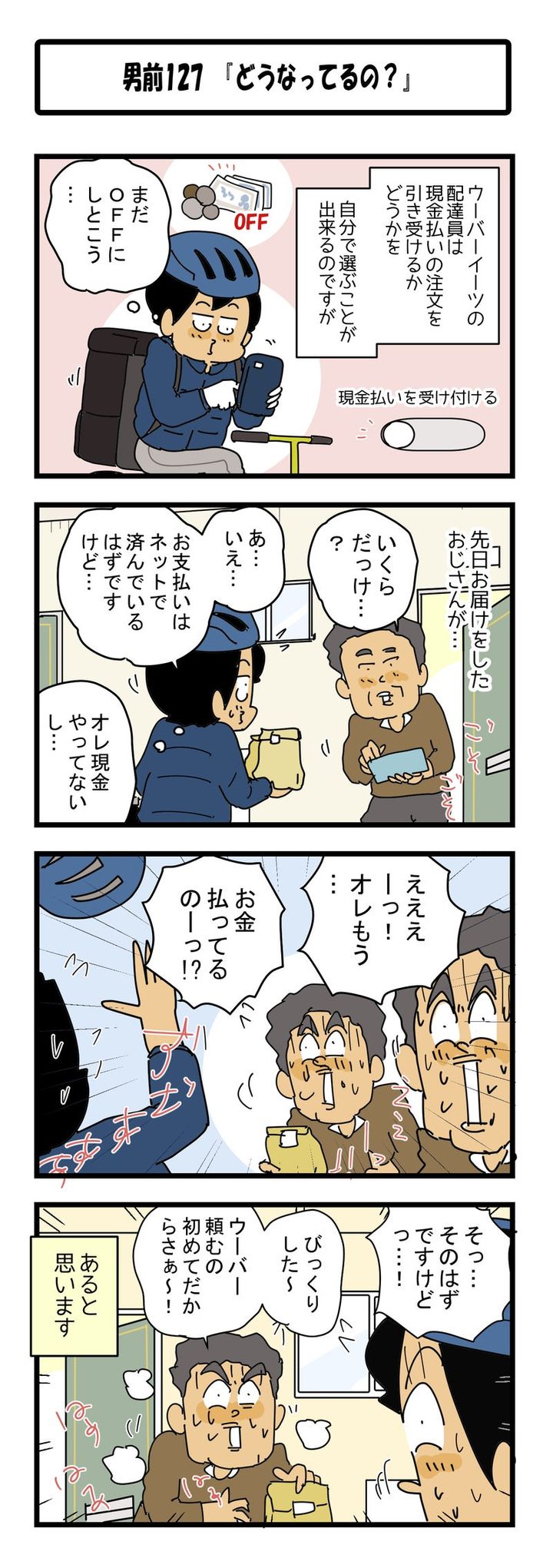 現金払いを受け付けない設定にしているというゆきたこーすけさん。配達先で、「いくらだっけ…?」と尋ねられ、「お支払いはネットで済んでいるはずですけど…」と答えます。すると、配達先のおじさんが、「えええーっ!オレもう…お金払ってるのーっ⁉」。想像以上に驚かれたことに驚くのでした。