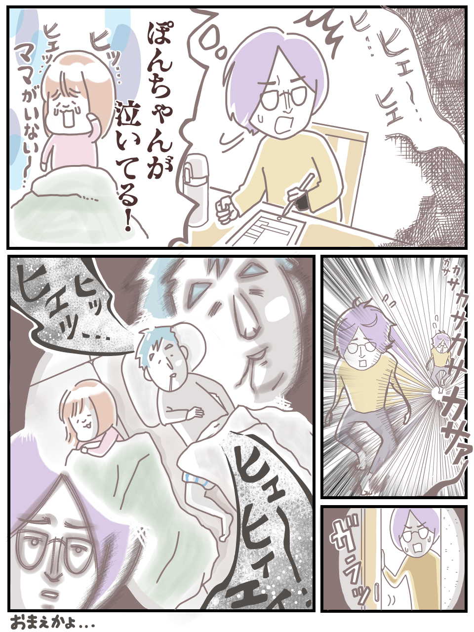 夜、きさらぎさんが漫画を描いていると、寝室から、「ヒェ~…ヒ ヒエ」という泣き声が聞こえてきて…?