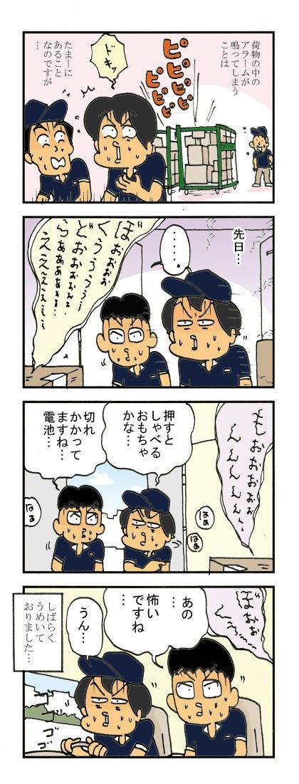 荷物の中のアラームが鳴ってしまうことは、よくあるのだそう。ゆきたこーすけさんが荷物を確認していると、「ぼおおおくうううう」とうめき声が聞こえてきます。ボタンを押すと喋るおもちゃだろうと推測。配達中もうめき続けており、不気味さを感じるのでした。