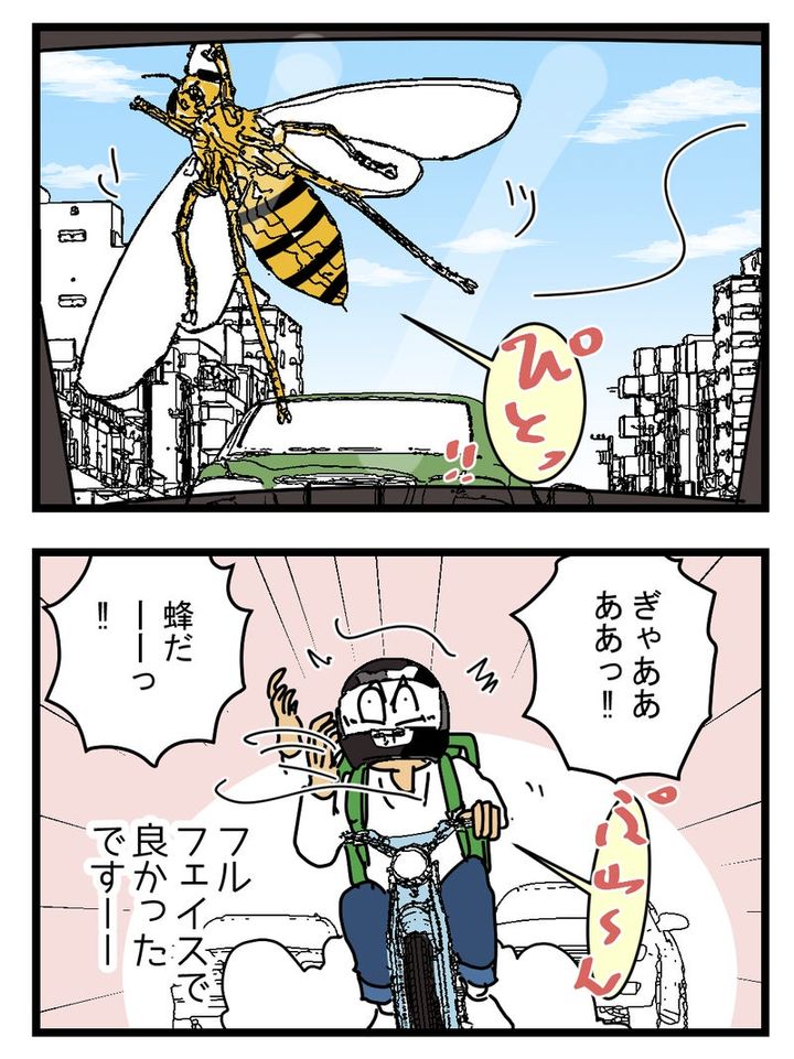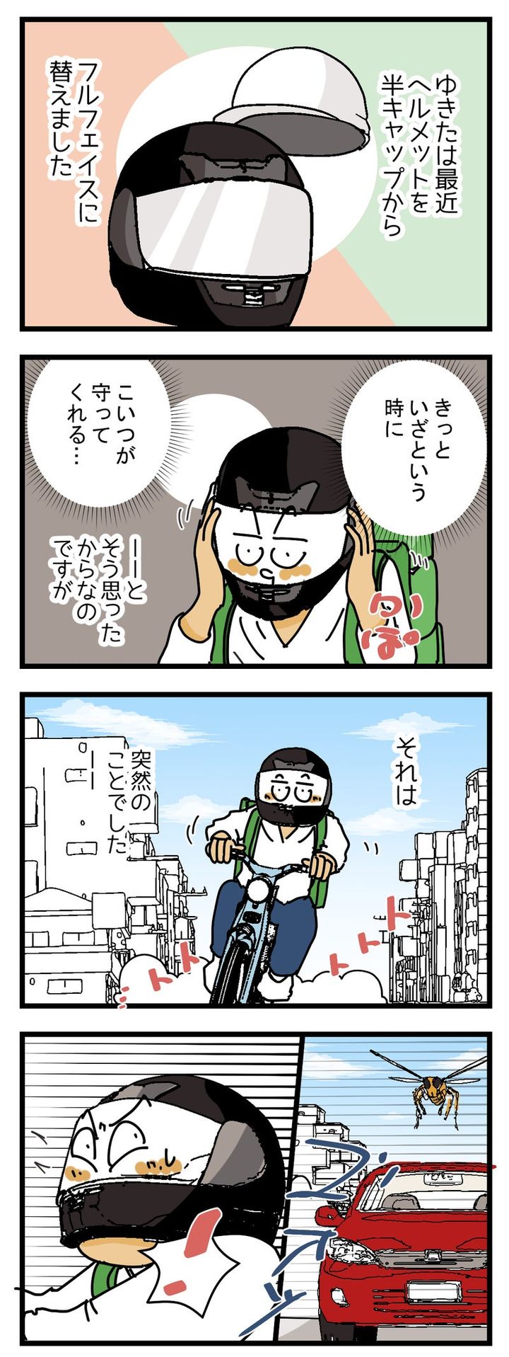 バイクのヘルメットを半キャップから、フルフェイスに替えたゆきたこーすけさん。バイクで走っていると、視界の隅に蜂の姿が。シールド部分に蜂が止まり、パニック状態になりますが、フルフェイスの恩恵を感じた瞬間でもあったのでした。