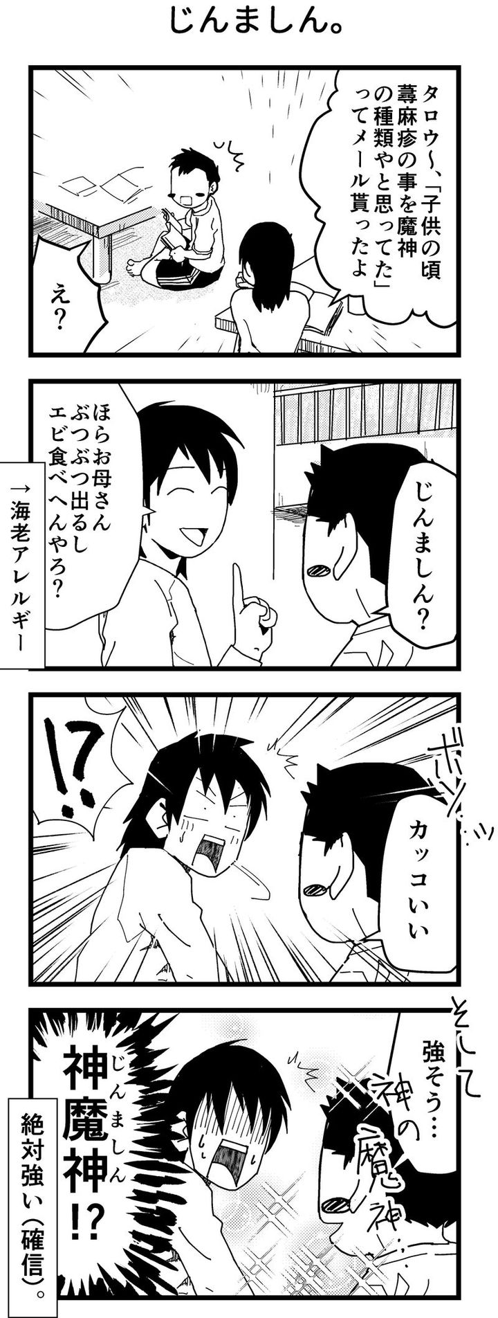 読者から、「子供の頃蕁麻疹の事を魔神の種類やと思ってた」というメールが届きます。タロウくんに報告すると、「カッコいい」と一言。頭の中で、蕁麻疹を神魔神(じんましん)と変換しているのでした。