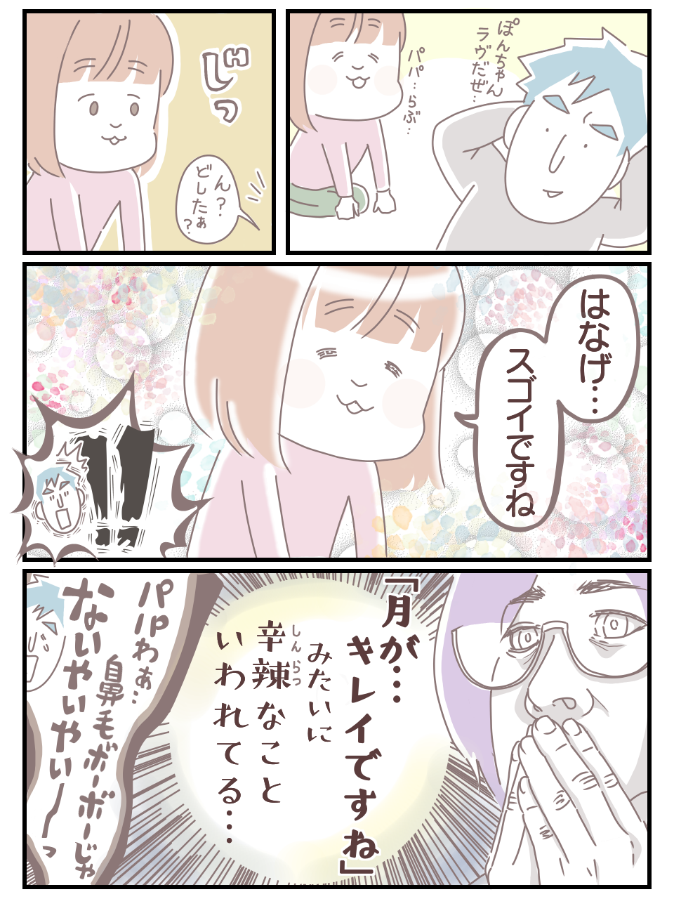 パパは「パパわぁ…鼻毛ボーボーじゃないやいやい〜っ」と大ショック!このやりとりを見ていたきさらぎさんは「『月が…キレイですね』みたいに辛辣なこといわれてる…」と文学的な感想を抱くのでした。