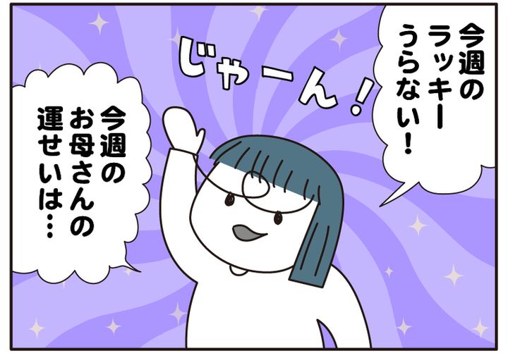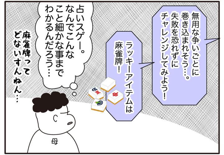 「蟹座の人の運勢は?」に続けて「無用な争いごとに巻き込まれそう…、ラッキーアイテムは麻雀牌!」とテレビの占いについて「なんでこんな細かい事までわかるんだろう」と、疑問を持つイズミさん。すると、めんちゃんが「今週のラッキーうらない!」と、突然占ってくれる事になったのですが…。