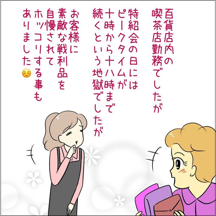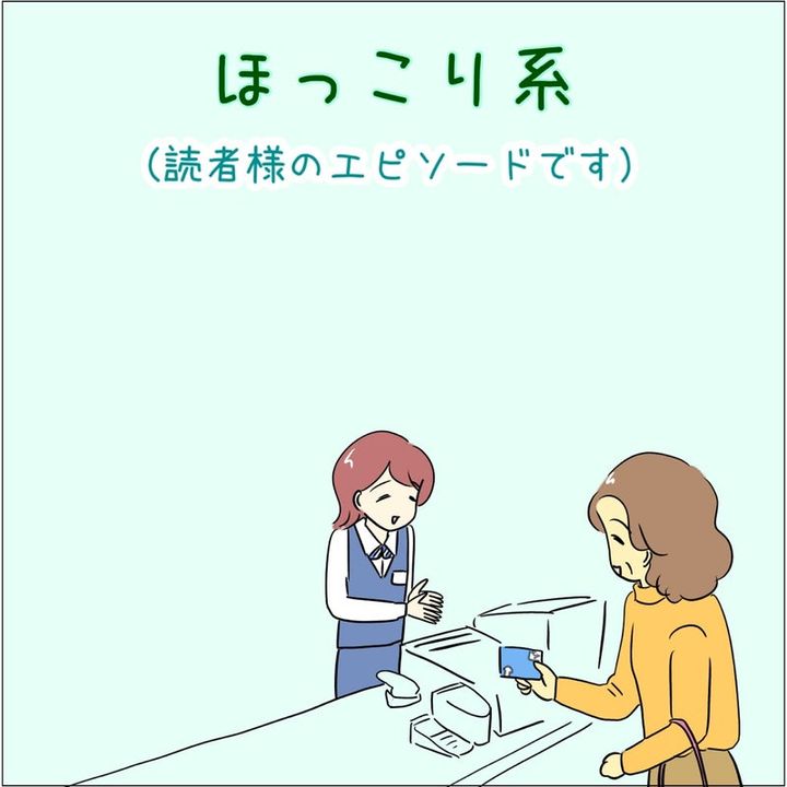 おそらく外国人のおじ様から、ドラッグストアの割引きクーポンをいただいた女性。「帰国しちゃいますからね」と伝えて、いただいたのだそう。スーパーのサッカー台で知らないおばあちゃん同士で買った商品について「可愛いわぁ」などと話しているのを見てほっこりしたそうです。他にも、百貨店の特招会のピークタイムはとても忙しいのですが、お客さんに素敵な戦利品を自慢されてほっこりした、百貨店の喫茶店員さんなのでした。