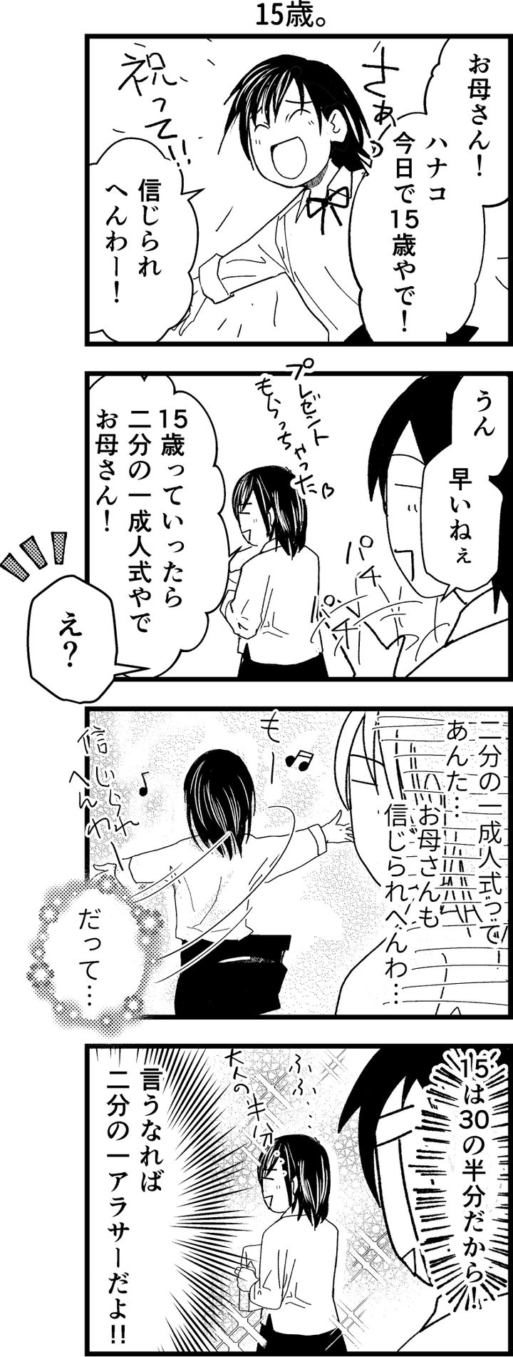 娘の成長を「早いねぇ」と目を細めながら喜ぶはるたけめぐみさん。しかし、その直後「15歳っていったら二分の一成人式やで」と言い放ったハナコちゃん。それを聞いたはるたけめぐみさんは「15は30の半分だから!言うなれば二分の一アラサーだよ!」と、心の中でツッコむのでした…。