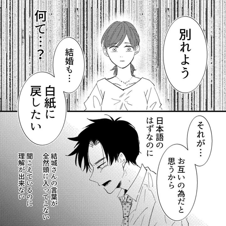 この漫画は、プロポーズをへて、結婚に向かっていくはずだったろく(@dndn.mushi)さんと恋人が、価値観や気持ちのすれ違いから揺れ動き、お別れを選ぶまでのエピソードが描かれています。せっかく一緒に暮らし始めたのに、会話は減り、気持ちはすれ違い、ついには「破局」の2文字が頭をよぎるろくさん。これではいけないと結城さんに話をしようと持ちかけます。結城さんもろくさんとの話し合いを望んでいましたが、彼の本音はろくさんとは全く違ったようです。『もう一度』第11、12話をごらんください。