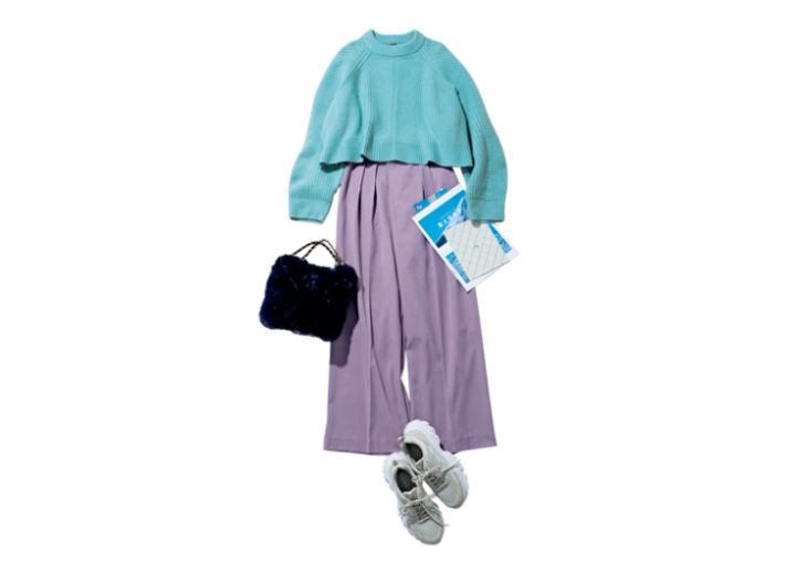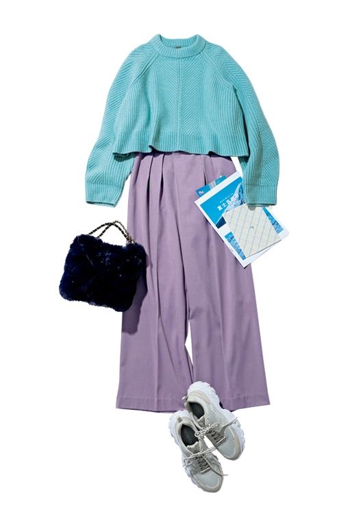 ニットセットプルオーバー(ニット)¥15,400/ミラ オーウェン ルミネ新宿2店、カラーワイドパンツ¥10,900/イェッカ ヴェッカ 吉祥寺、エコファーバッグ¥13,750/ダイアナ(ダイアナ 銀座本店)、スニーカー¥8,800/ORTR( ダブルエー)