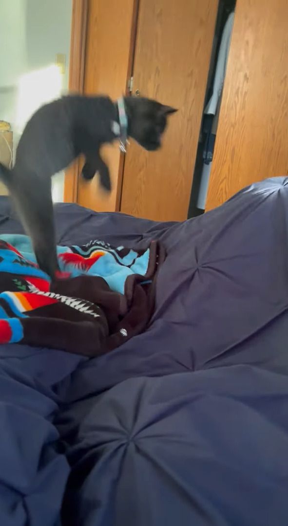 ベッドの上を散策する子猫。布団の中で飼い主さんが足を動かしたら・・ビックリ!!