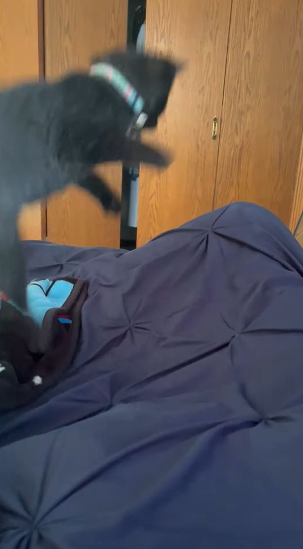 それもあって、飼い主さんがベッドの中で足を少し動かしてみると・・・。 突然のことに、クリープはビックリ!