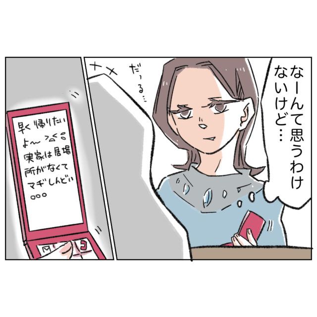 「早く帰りたいよ~!実家は居場所がなくてマヂしんどい・・」とすかさずメールを打つのでした・・。