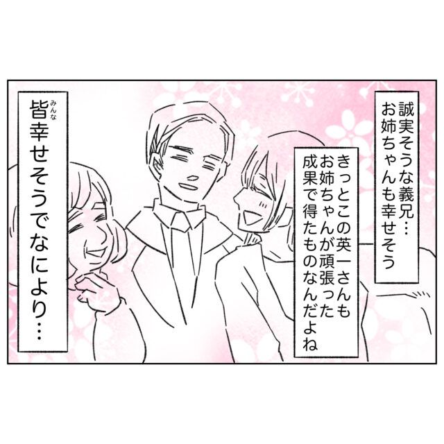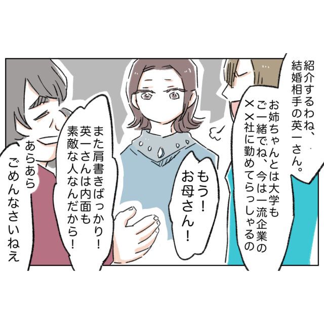 「紹介するわね、結婚相手の英一さん。お姉ちゃんとは大学もご一緒でね。今は一流企業の××社に勤めてらっしゃるの」と言うと、