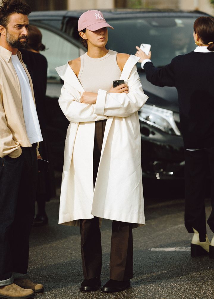 タンクトップにコートを羽織るアンバランスなコーデが、どこかセンシュアルな印象。