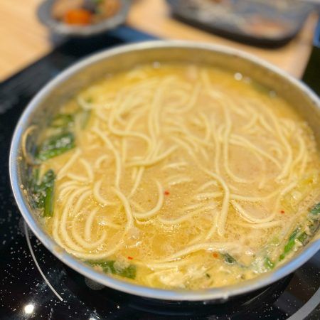 〆は雑炊・うどん・ちゃんぽんの中から選べるのですが、私はちゃんぽんにしました。 うどんともラーメンとも違うモチっとした麺にもつ鍋のスープがぐんぐんしみ込んで、たまらない美味しさでした!