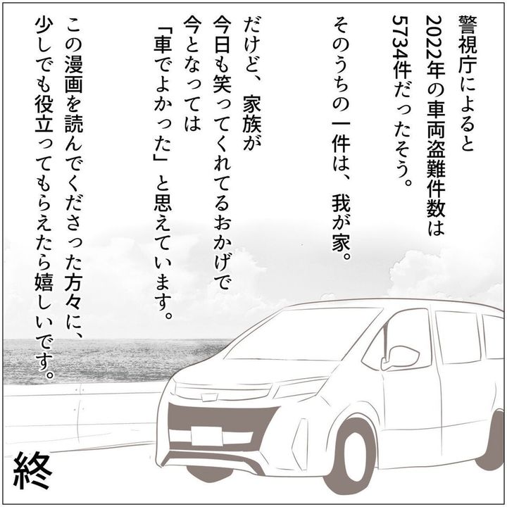 そして、ぽよ母さんの夫が言うように、家族の身に被害がなかったことが、この事件の不幸中の幸いだった部分です。狙われた車両に誰かが乗っていたらと思うと怖いですよね。こうした事件が身近で起きていることを認識し、車の防犯について見直す機会としましょう。