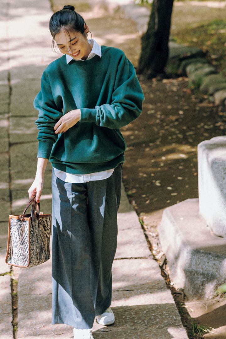 オックスフォードシャツ着回し スウェットトップス¥24,200(チャンピオン/ヘインズブランズ ジャパン カスタマーセンター)グレーのワイドパンツ¥31,900(アパルトモン/アパルトモン 神戸店)バッグ¥55,000(ア ヴァケーション/ノーベルバ)スニーカー¥18,700(ニューバランス/ニューバランスジャパンお客様相談室)ピアス¥31,900(プラウ)