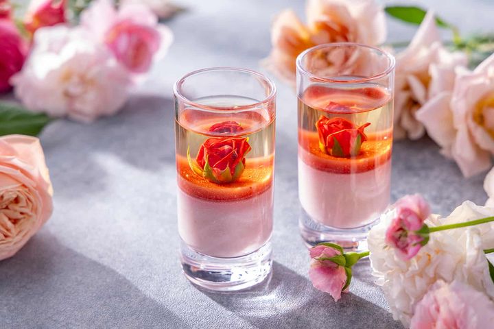 いちごとバラのヴェリー二/3層からなるヴェリー二。いちご風味のミルクゼリーの上にいちごのゼリーを重ね、トップにはWABARAの花びら茶「かおりかざり」を使用したゼリーを載せベルローズを閉じ込めました。バラの華やかな香りがいちごの味を引き立てます。