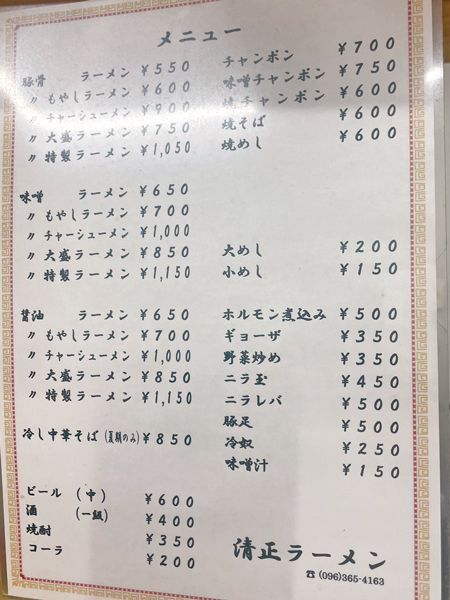 夜遅くまで空いていて、赤のれんで清正ラーメンと書いてあるお店の佇まいがずっと気になっていました。 常連さんの多い昔ならではのラーメン屋さんでメニューが多くリーズナブルで気軽に行けるお店です。
