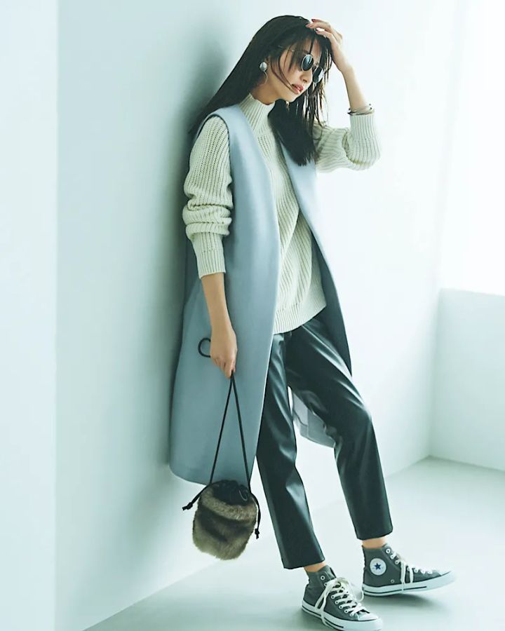 黒のレザーパンツを今っぽく穿くなら、足元をきれいに魅せるゆるシルエットを選ぶのが◎。ボトムスが辛口なぶん、上半身はニュアンスカラーのタートルニットや、キレイ色のロングジレでバランスを取って。仕上げにファーバッグをプラスすれば、こなれた大人の秋冬コーデが完成します。