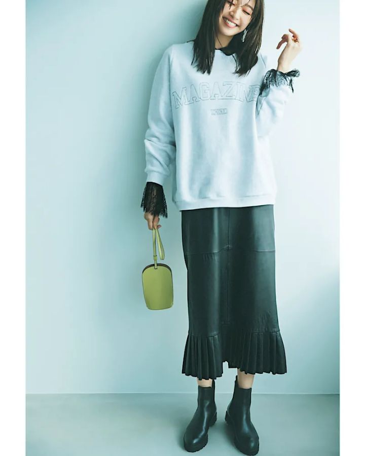 ほんのり甘い裾フリルデザインのレザースカートなら、辛口に寄りすぎずレディな着こなしが可能。オーバーサイズのロゴスウェットを合わせて、ほどよくカジュアルダウンするのが今っぽさを出す秘訣です。スウェットの中に仕込んだ、レースブラウスの小粋な使い方にも注目を。