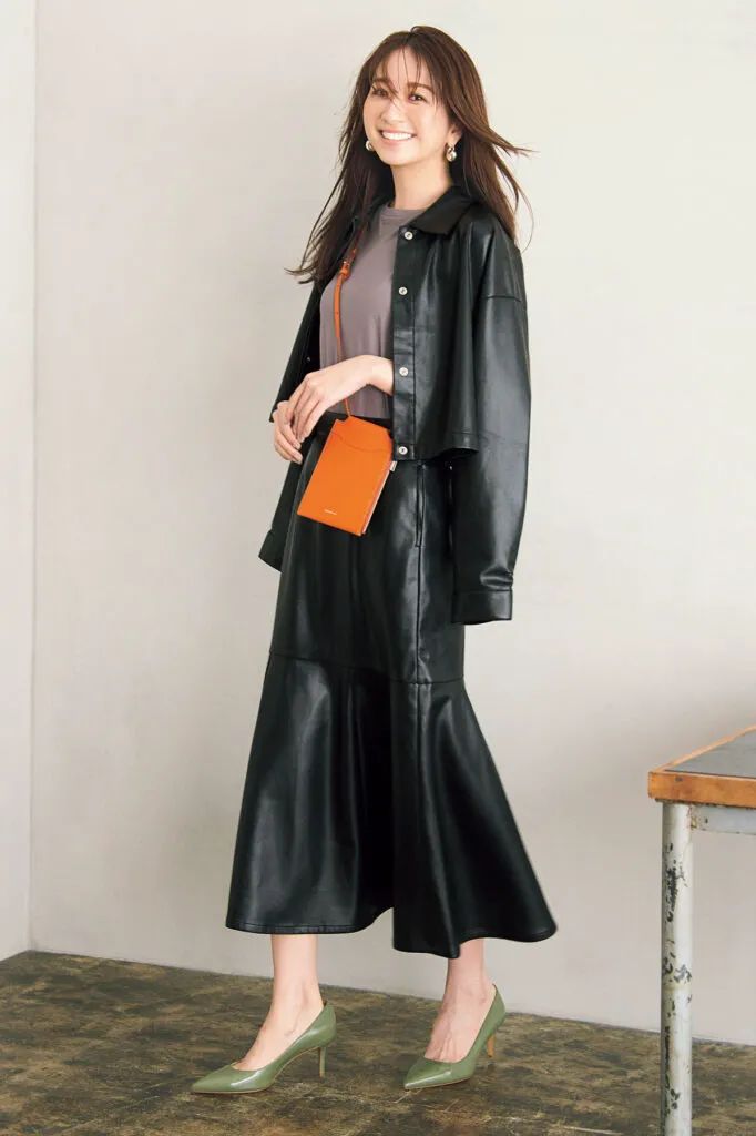 黒レザーのセットアップも、こだわり抜かれたきれいめフォルムならエレガント見えが可能。ショート丈のジャケットと、フレアラインが美しいスカートが作り出す絶妙なバランス感が、女っぽさを演出します。カジュアルなTシャツをインナーに仕込めば、こなれた旬の雰囲気に。