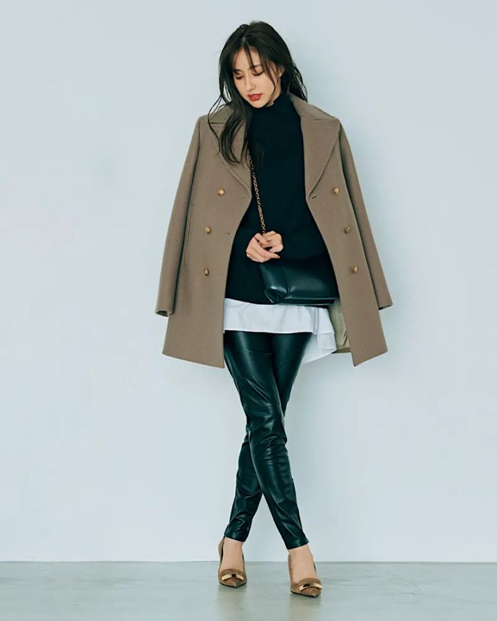 いつもの黒スキニーも、素材をレザーに変えるだけで一気に旬顔に! ほどよく存在感を醸すレザーの艶とハリ感が、コーデ全体のオシャレ度をぐんと上げてくれます。ジャケットとシューズの色を合わせて、まとまりのある大人の雰囲気に仕上げるのがポイント。