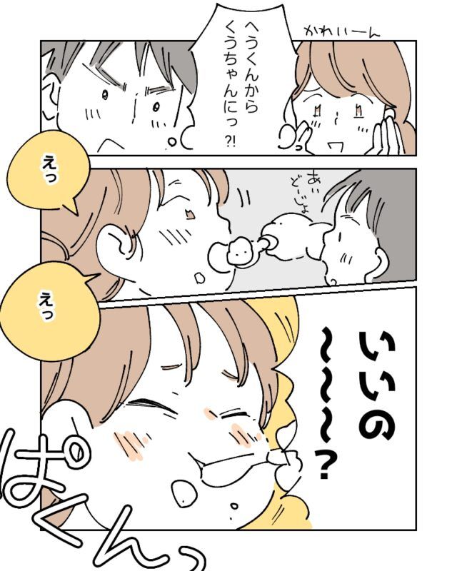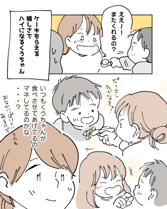 可愛らしいやり取りにキュンとしますね~!くうちゃんに食べさせてあげたケーキには、きっとへうくんの「いつもありがとう」の気持ちが詰まっていますね!