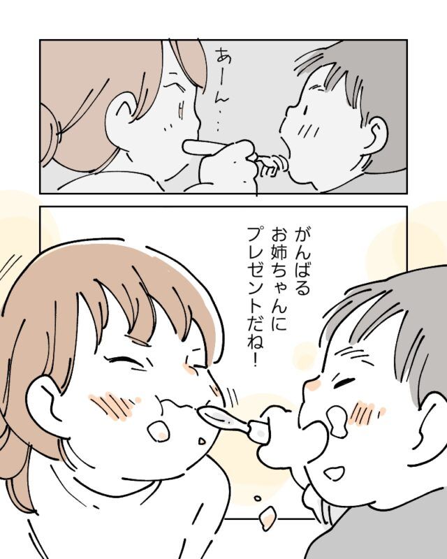 この日ははじめて、へうくんからお姉ちゃんへ食べさせてあげていました。