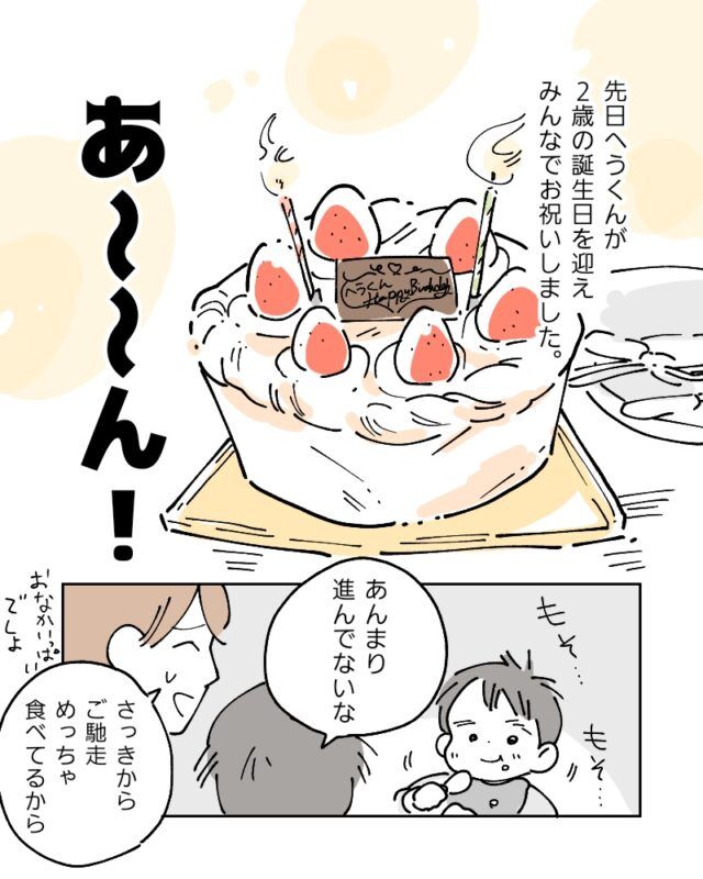 4歳の女の子くうちゃんと2歳の男の子へうくんのママであるマキノさんから、へうくんの誕生日のお話です。少し前に2歳の誕生日を迎えたへうくん。バースデーケーキを食べていたへうくんにくうちゃんが近づくと・・・。