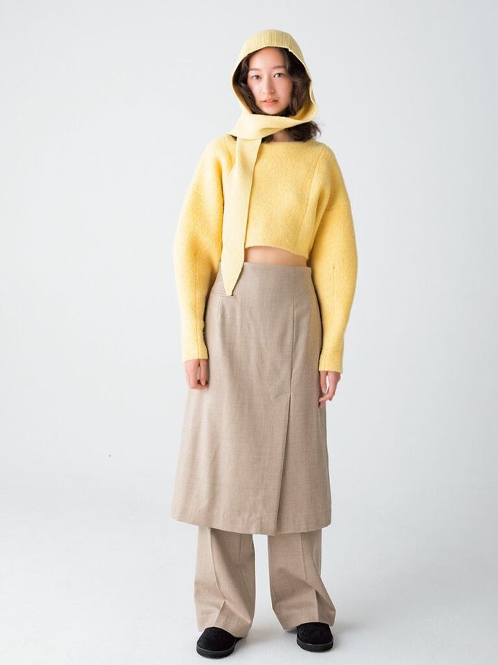 ボタンを留めて顔まわりにフィットさせてもかわいい。バラクラバ¥16,500 ニット¥30,800(共にンニット/セグレイト nknit.nknit@gmail.com) レイヤードパンツ¥25,300(トゥデイフル/ライフズ代官山店 TEL:03・6303・2679) シューズ¥24,000(マチュアリー/ビームス ウィメン 原宿 TEL:03・5413・6415)