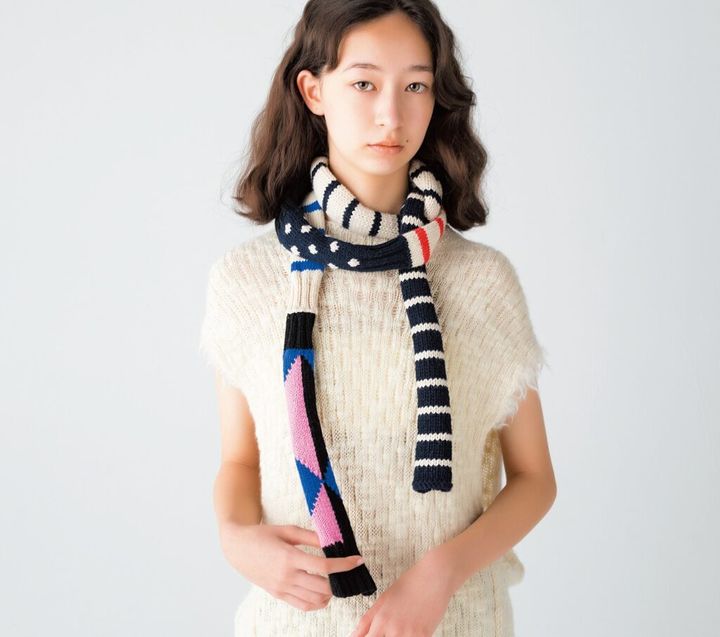 スコットランドで手作りされるニットマフラーは、色使いや柄に遊び心が漂う。写真のようにダブル使いしても。ショートマフラー¥94,595 ボーダーマフラー¥38,610(共にラ フェティッシュ/リディア TEL:03・3797・3200) ニットドレス¥36,300(ウーア/ビューティ&ユース ユナイテッドアローズ みなとみらい店 TEL:045・222・7201)
