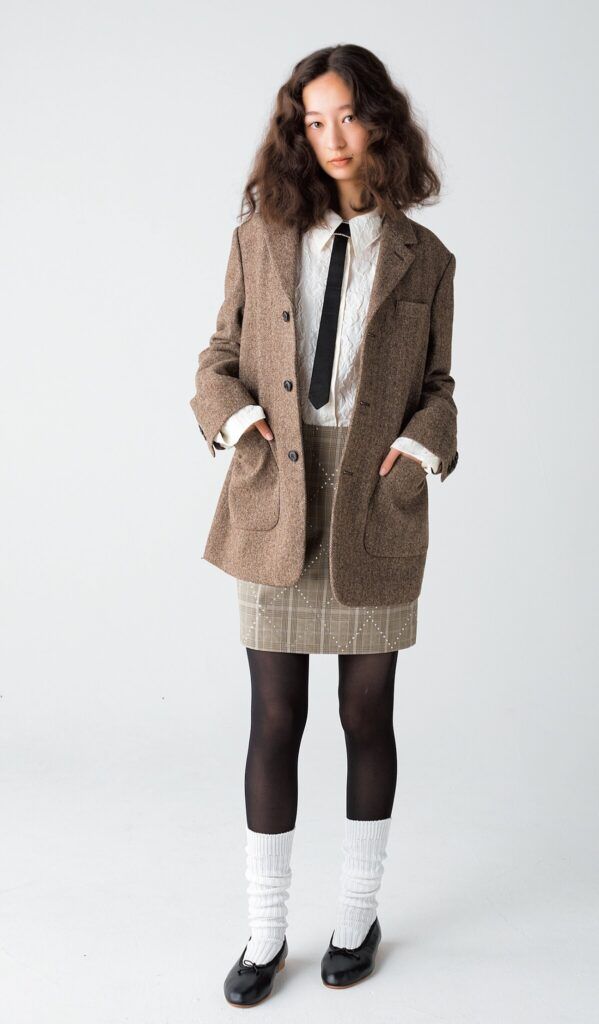 サテン素材のナロータイで、ひとひねりあるトラッドを表現。結び目部分にはビジューが輝く。ナロータイ¥5,940 ミニスカート¥16,940(共にリリー ブラウン/リリー ブラウン ルミネエスト新宿店 TEL:03・6457・8555) エンボスシャツ¥40,700(エナス/リーリ contact@enas-reere.com) ジャケット¥53,900 ソックス¥2,970(共にザ シンゾーン) バレエシューズ¥38,500(リトルワンヴィンテージ) 以上シンゾーン 表参道本店 TEL:070・1389・5295 タイツはスタイリスト私物