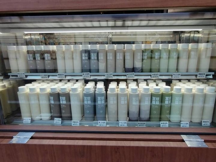 注文カウンターのショーケースにはさまざまな豆乳がずらり。普通の豆乳から、ヨーグルト豆乳、あずき豆乳、抹茶豆乳、きゅうり豆乳などここでしか見たことないようなフレーバーがありました。