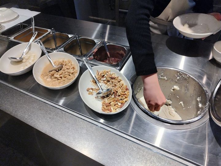 店員さんが目の前ですくってトッピングしていってくれます。トッピングの内容も日によって変わるそうです。この日はクルミや緑豆、ひよこ豆、白きくらげなどがありました。
