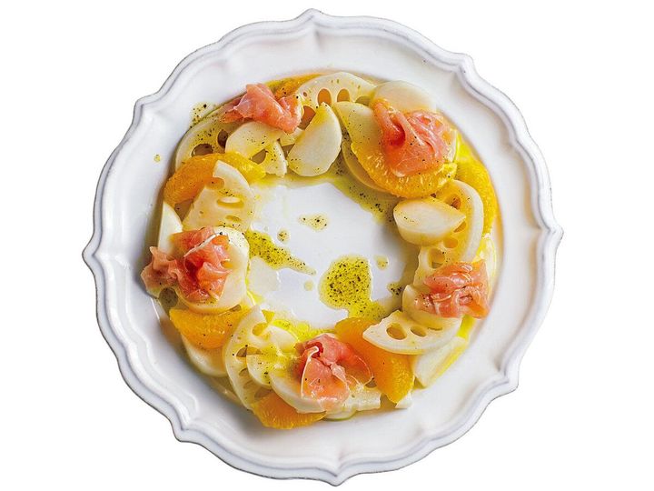 今回は、白い野菜にフルーツのカラーが映えて美しい「れんこん、かぶ、オレンジのリースサラダ」のレシピをご紹介します。