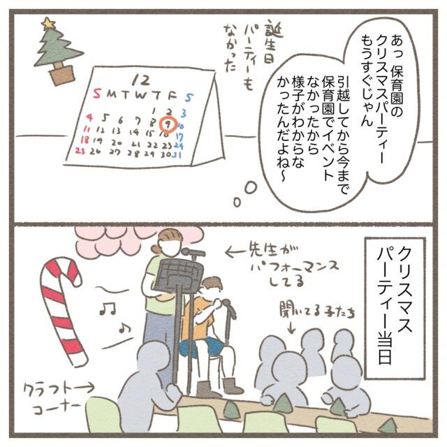 3. [24]季節真逆のクリスマスパーティー。新しい友達の問題に気付く母。我が家の登園しぶり奮闘記|みゅこの育児絵日記