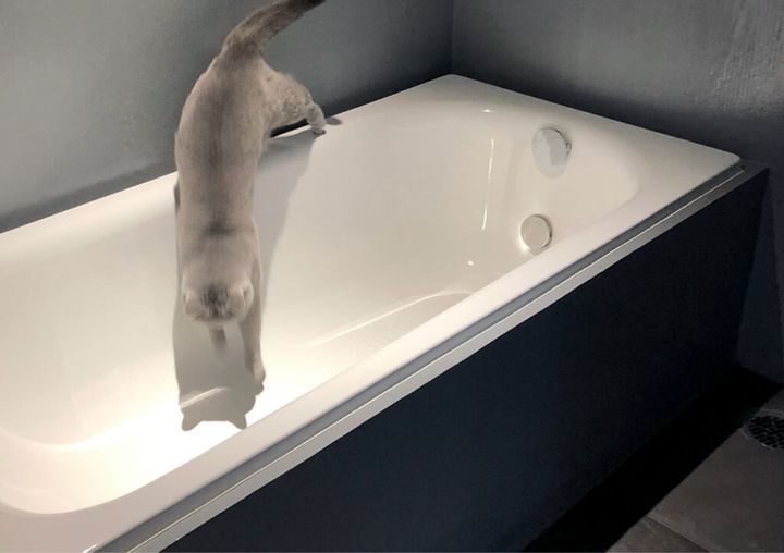 お水が入ってない時間を狙って、お風呂に潜入します。床が濡れてるときは、手足がベチャベチャになるので、入らないのがお風呂のプロ。