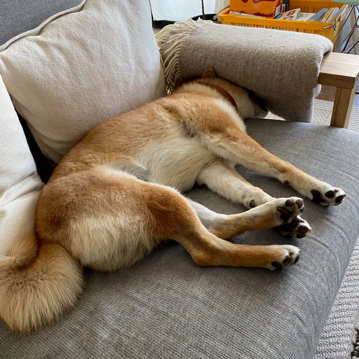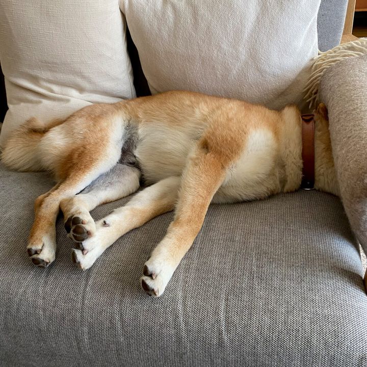 こんにちは、ハルくんです。この日は朝から冷た〜い雨降りでした。お散歩のときにかーちゃんが着せてくれたカッパは誰かのお下がりらしく、ぼくにはちょっとパッツンパッツン。お鼻とお尻がびしょびしょになってしまいました。そういう日は、ごはんの後の二度寝のポジションにも工夫が必要です。かーちゃんからソファの権利をすべて奪い取って、肘掛のブランケットにお鼻を突っ込み、手足を投げ出したのびのびスタイルが最適。かーちゃん、覗かないでね。