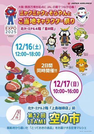 12月16日(土)・17日(日)、大阪国際(伊丹)空港で「ITAMI空の市」と「ミャクミャクとそらやんとご当地キャラクター祭り」が同時開催されます。