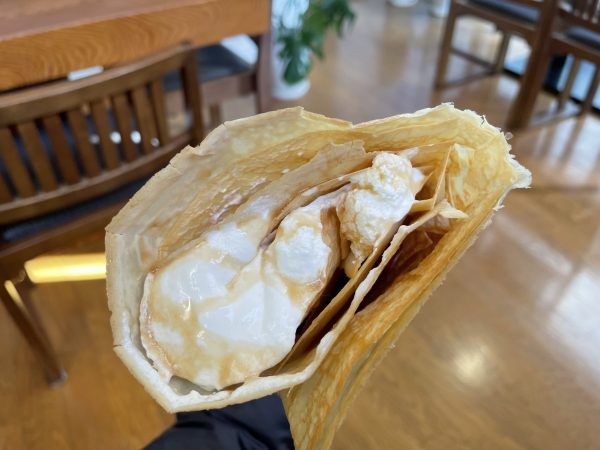 嬉しいおっきめのクレープ♪生地のはしっこはぱりぱり、そして中側はもっちりしています。生地は分厚くないので食べやすいです◎メープルシロップ×クリームという、私的に最高の組み合わせで、クリーム好きにはたまらないなめらかクリームがたっぷり…ぺろっと食べてしまいました!