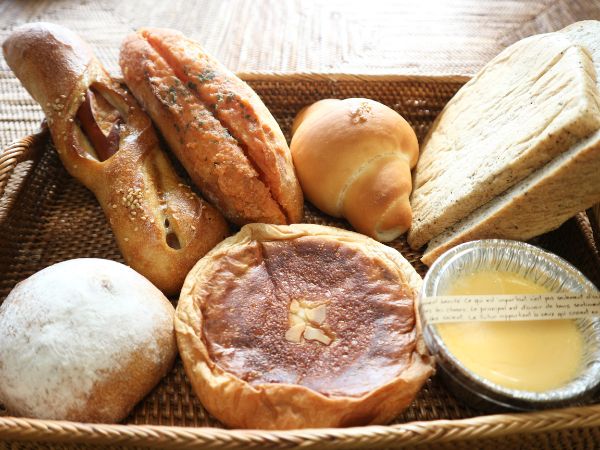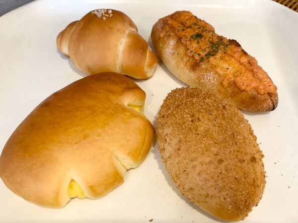 人気No. 1パンのとろけるクリームパン(前列)は、某国民的アニメのクリームパンキャラクターの形に似ていて何だかカワイイですよね?黄色いカスタードクリームは甘すぎず、卵黄の風味を大事に作られています。黒ごまきんぴらバーガー(後列左)は、他と比べ少し小ぶりサイズではあるものの、やさしい味付けのきんぴらがとてもおいしく、バケットタルティーヌ(後列右)もチーズがおいしくてどちらも食べ応えありでした。