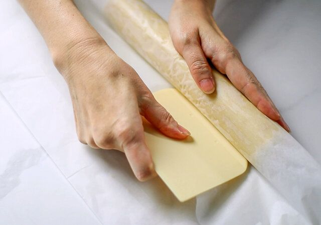 ⑧ オーブンシートに移し、転がしながら生地の太さを整え表面をなめらかにします。オーブンシートをきつくしめながら転がしたり、カードなどを使って生地をしめるときれいになります。