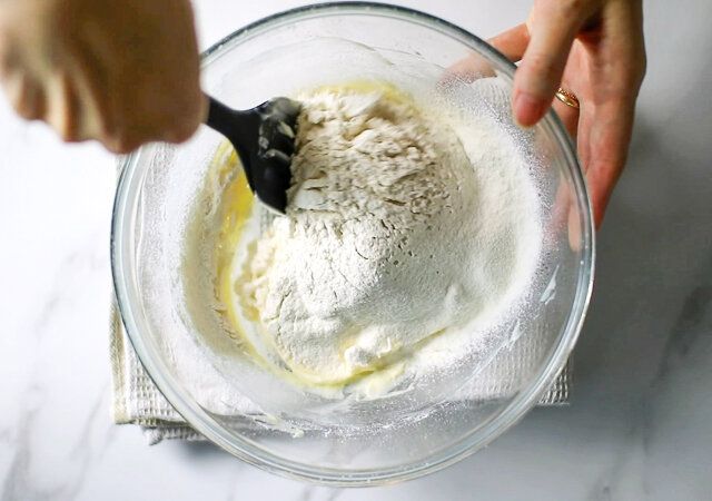 ④ 薄力粉、ベーキングパウダー、塩を合わせてふるい入れ、さっくりと混ぜ合わせます。